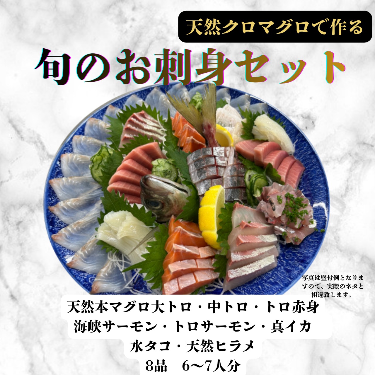 新鮮な旬のお刺身セット 8品 6~7人前をお届けします。