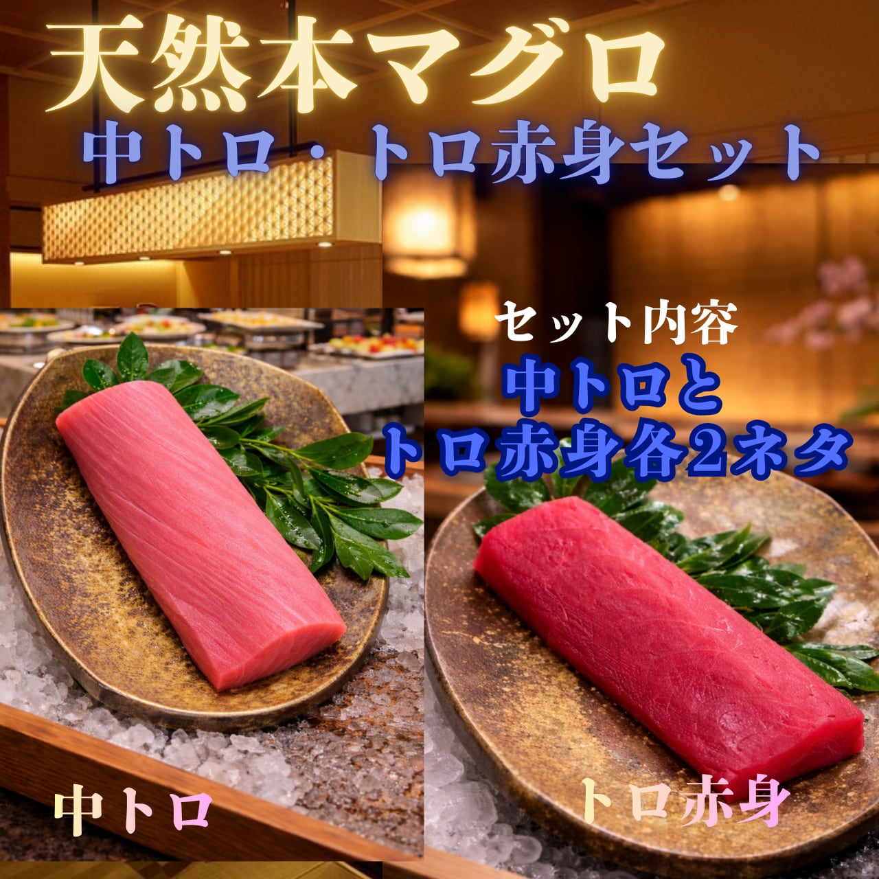新鮮な天然本マグロの中トロとトロ赤身を、それぞれ2ネタずつお届けします!