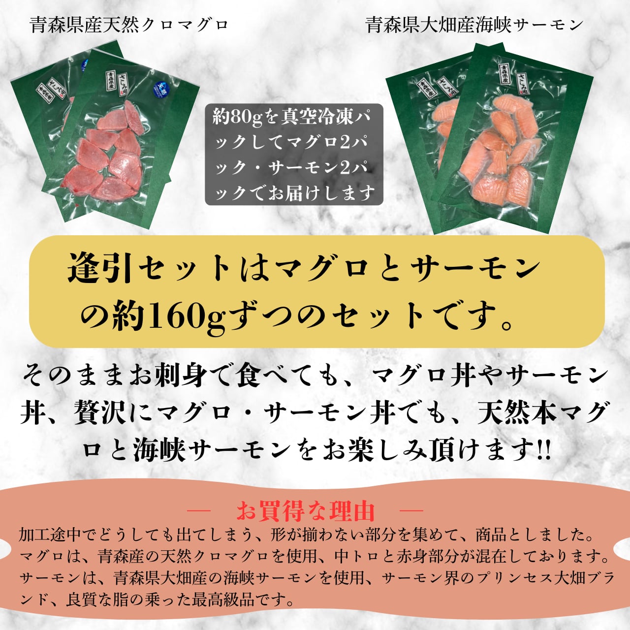 新鮮な青森県産の天然本マグロと大畑産の海峡サーモンを贅沢に組み合わせた特別なセットをお届けします!